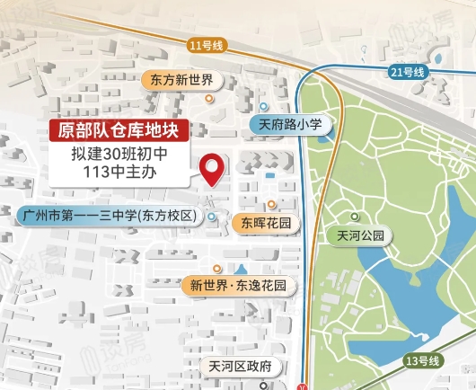东方二路、113中学旁边,那块空了挺久的部队仓库用地;规划正在推进——拟建设1500个学位的30班初中!规模不小,30个班,大约1500个学位,总建筑面积1.8万平,该有的教学楼、运动场、地下配套,全都有。更重要的是,它将由天河的老牌强校——113中学接手,办成新校区!