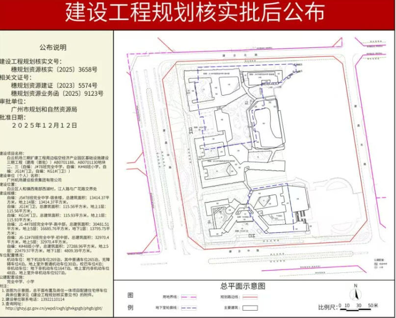 学校位于广州市白云区人和镇西南部西湖村,江人路与广花路交界处,小学规划48个班,完全中学规划78个班(初中42班和高中36班)。完全中学共设置42班初中和36班高中,其中初中生预计招生2100人,教职工206人;高中预计招生1800人,教职工177人。