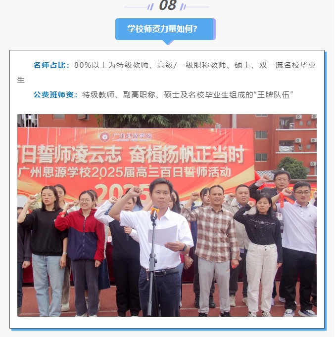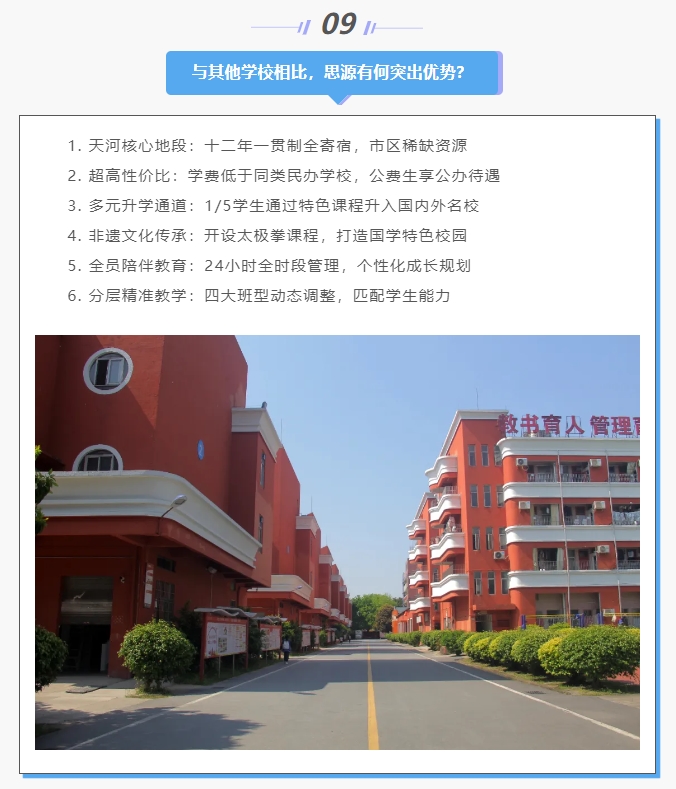 广州思源学校创建于1994年,是广州市教育局审批的“十二年一贯制”民办全寄宿制学校,迄今已有31年办学历史。学校坐落于天河区珠吉街道,是天河区最早开设高中部的三所民办学校之一。2023年迁址新校区,占地面积超90亩,可容纳4000人寄宿学习。 类型:十二年一贯制民办学校 性质:民办全寄宿制 招生范围:全市招收应届生,不限户籍 学杂费: ● 高中公费生:享受公办学校同等政策 ● 高中普费生:学费29800元/学期,住宿费2200元/学期 ● 初中普费生:学费19800元/学期,住宿费2000元/学期 (具体以教育局最终公示为准,伙食、校服等其他费用按实收取) 奖助政策:每年投入数百万用于奖励优秀学生及资助贫困生 食宿条件:全寄宿制,6人/间,配备独立洗漱区、阳台、书桌、衣柜,食堂可容纳2200人用餐 地址:广州市天河区珠村走马岗东路155号